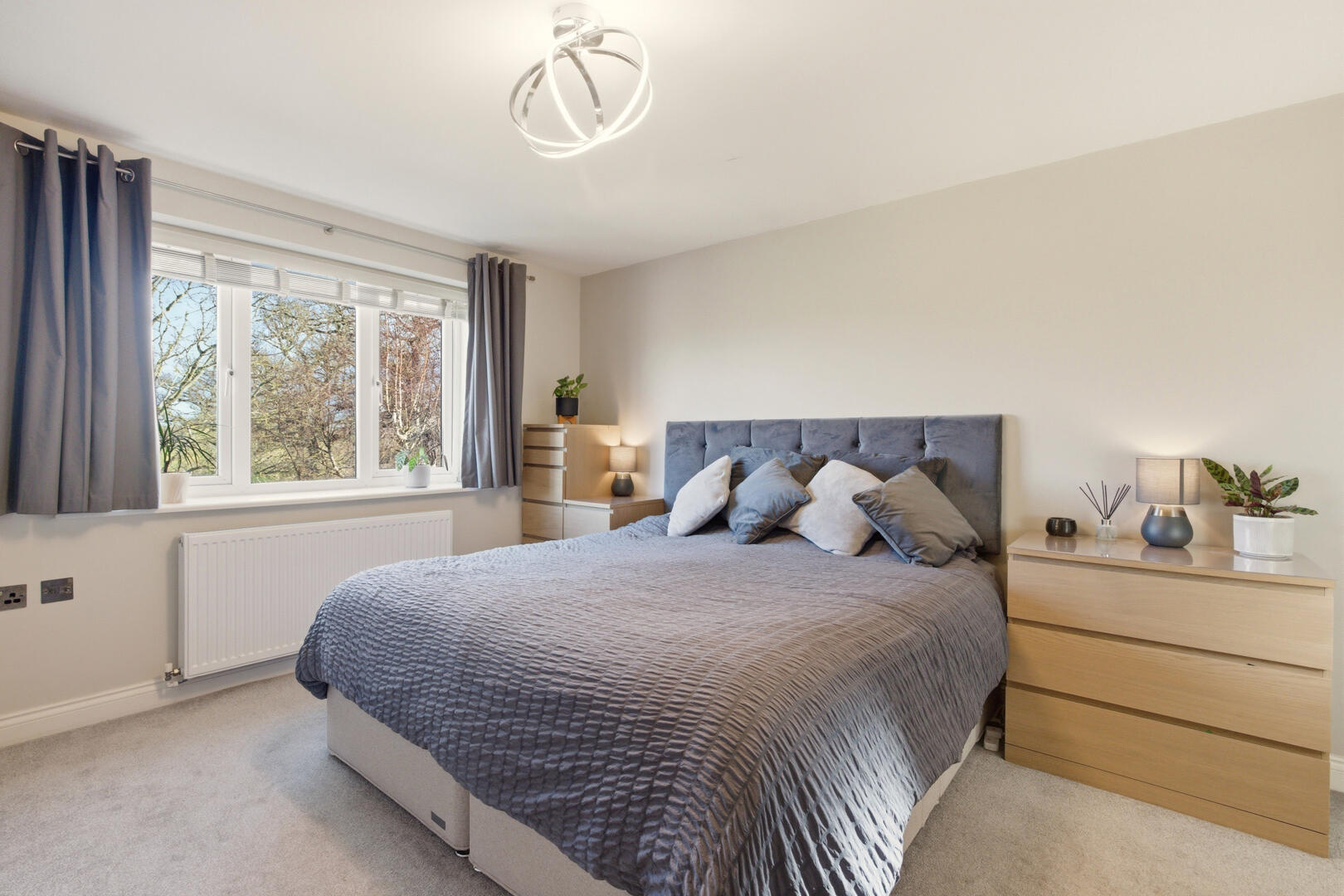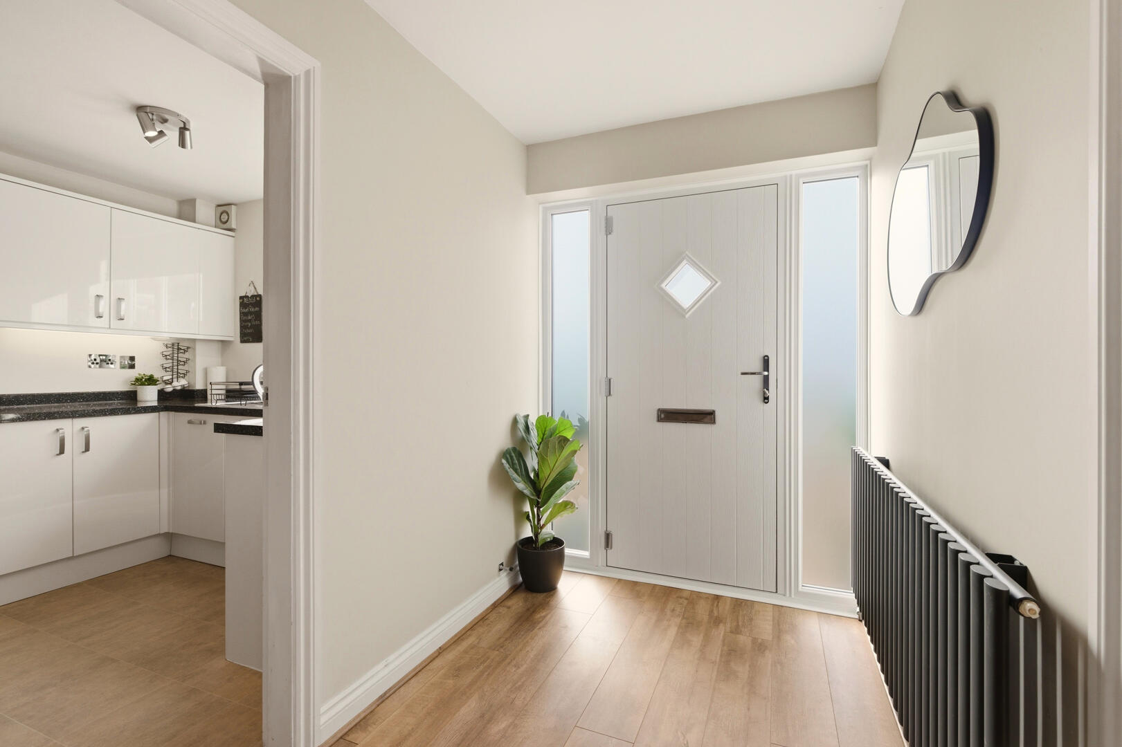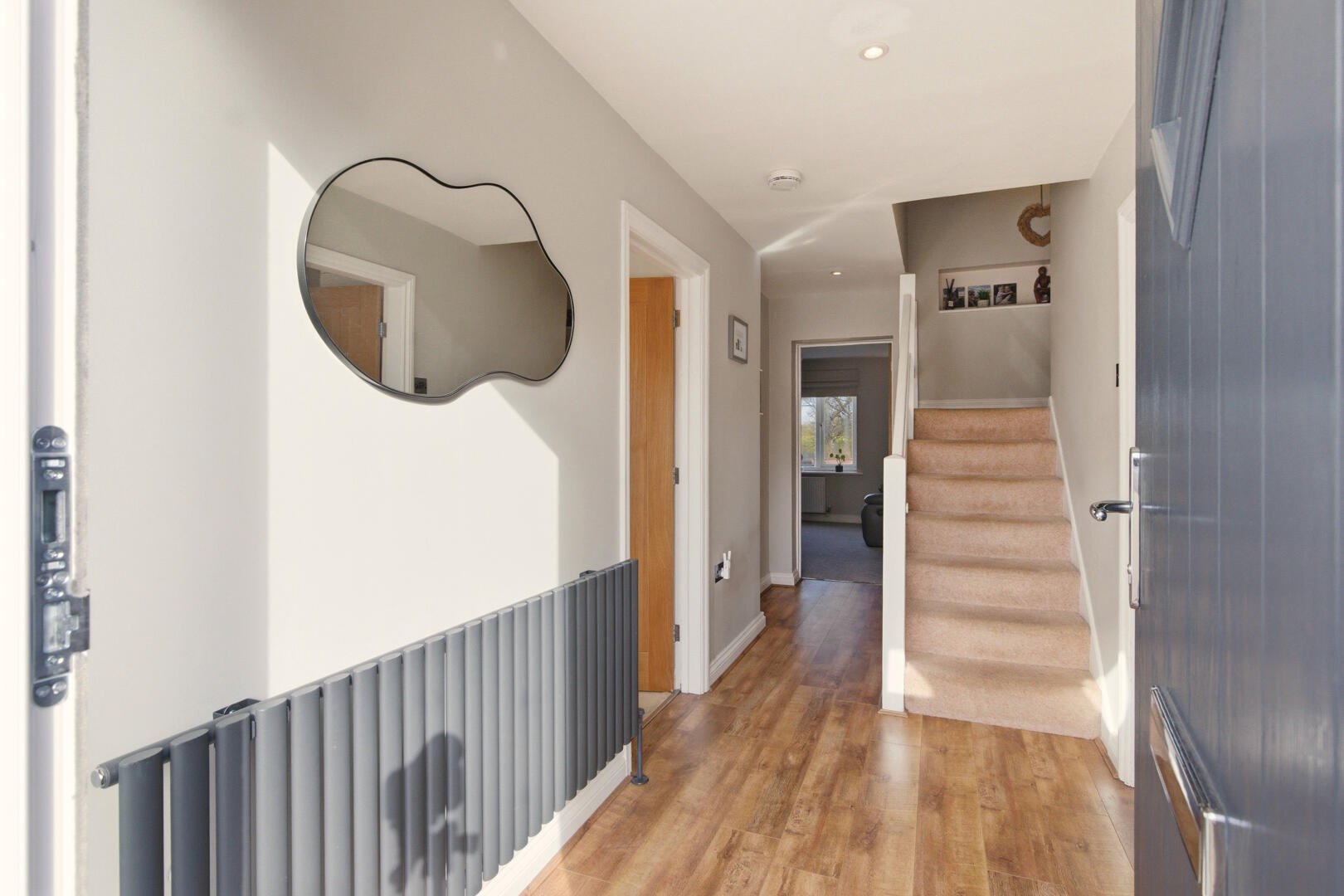Set behind a wide block-paved driveway, the property offers generous off-street parking alongside an integral garage. A contemporary entrance door opens into a bright central hallway finished with high-quality laminate flooring and a calm, neutral palette.