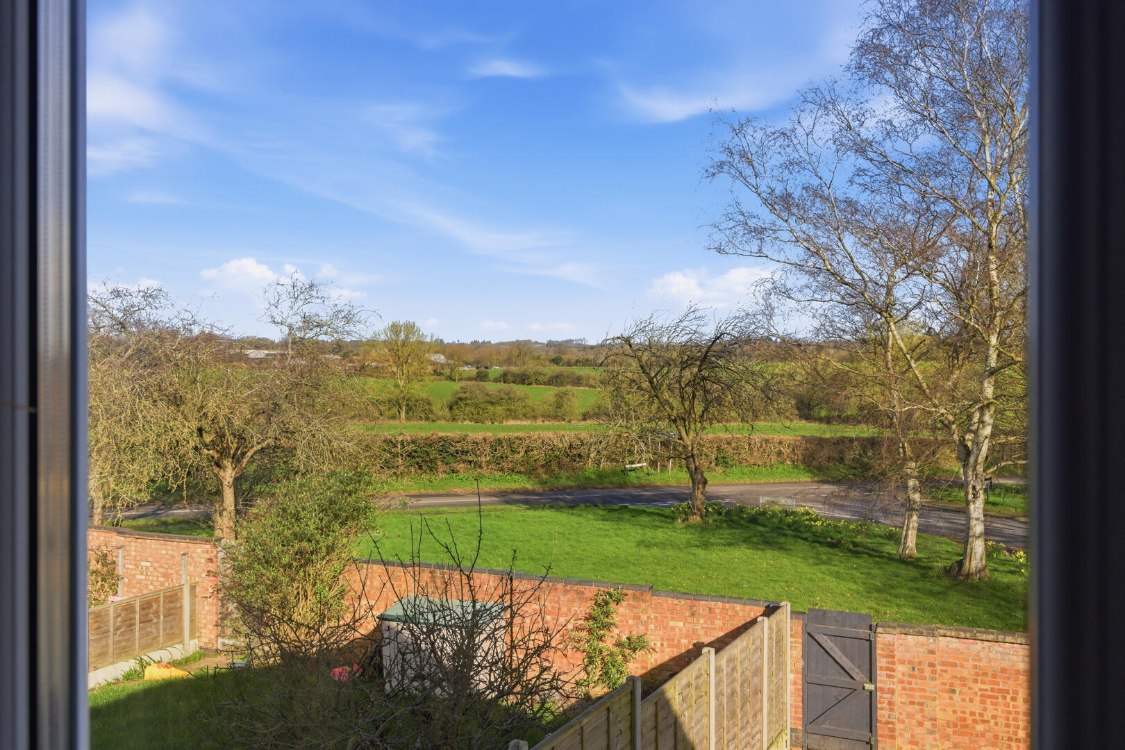 Outside, the rear garden is mainly laid to lawn with fenced boundaries and a paved path. Beyond the garden wall the landscape opens out to expansive agricultural fields and hedgerows, giving the property an appealing sense of space and outlook rarely found within village settings. (The garden room currently in the garden is not included in the sale.)
