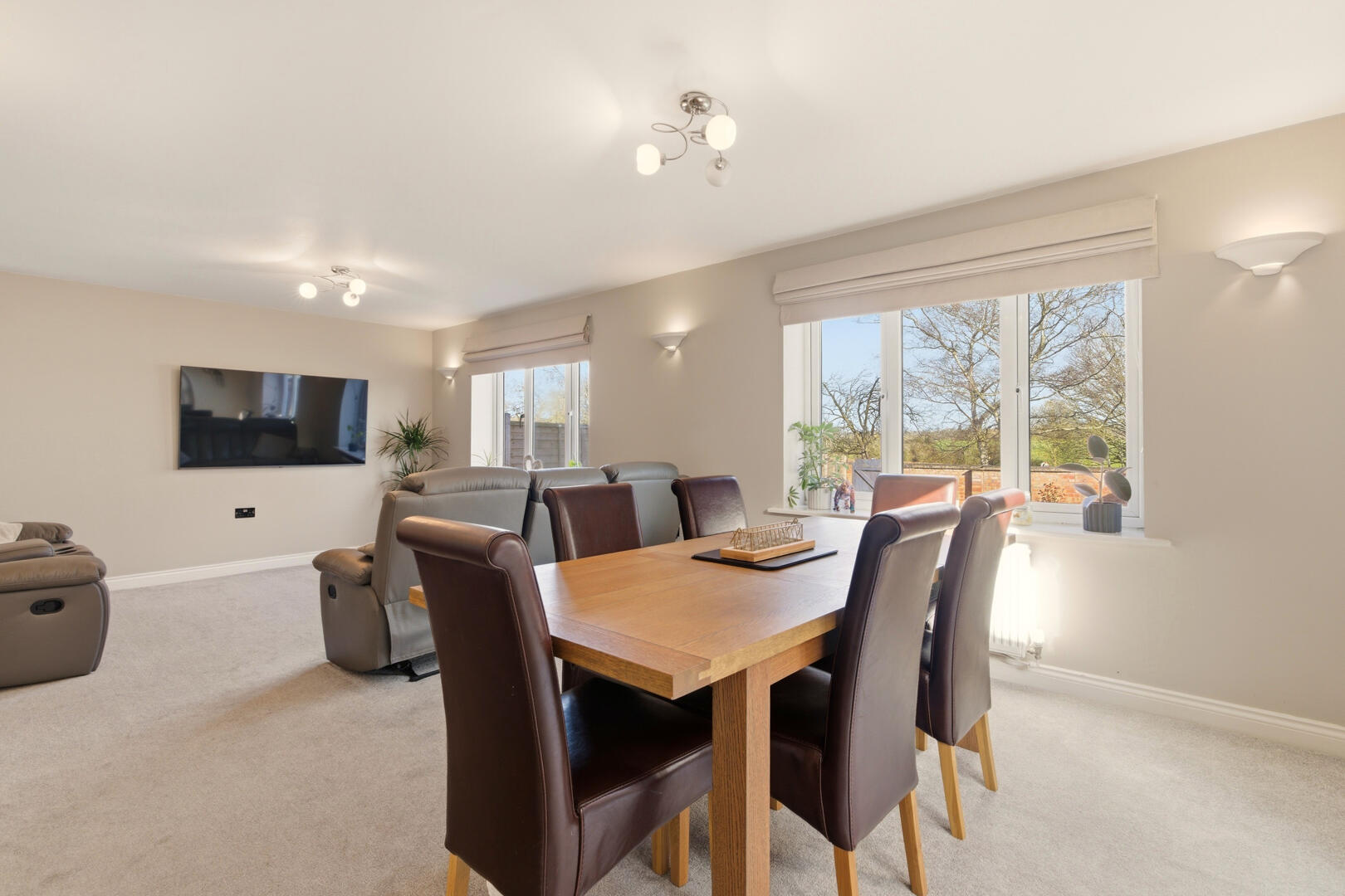 To the rear of the house, a generous family room with adjoining dining area forms the principal living space. Wide windows frame views across the garden towards the surrounding farmland, drawing in excellent natural light and creating a relaxed setting for everyday living. A separate living room sits to the front of the house, providing a quieter reception space.