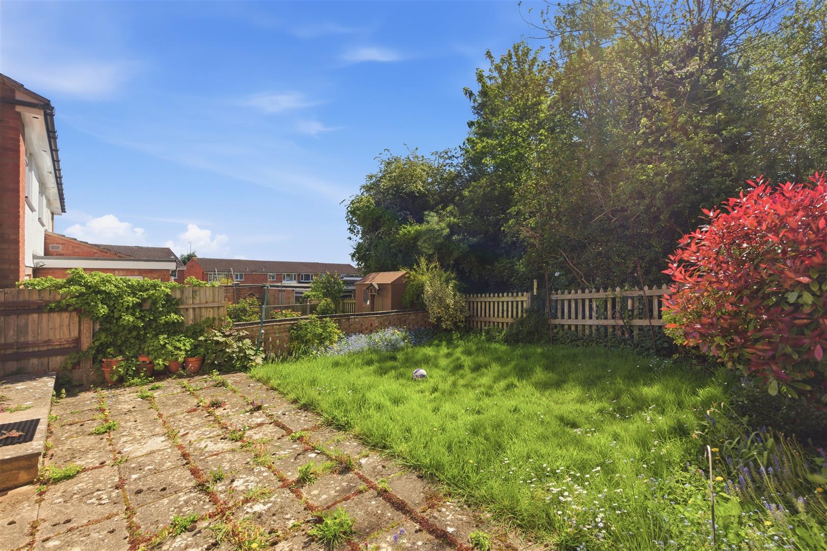 The rear garden is private and enclosed, combining patio and lawn with a mature, leafy backdrop that gives a strong sense of seclusion. It offers a solid foundation for landscaping, while already functioning as a pleasant outdoor space.