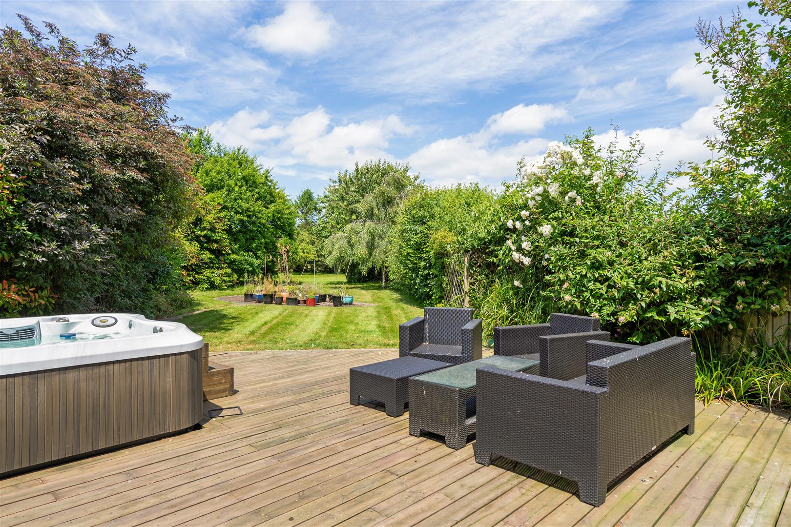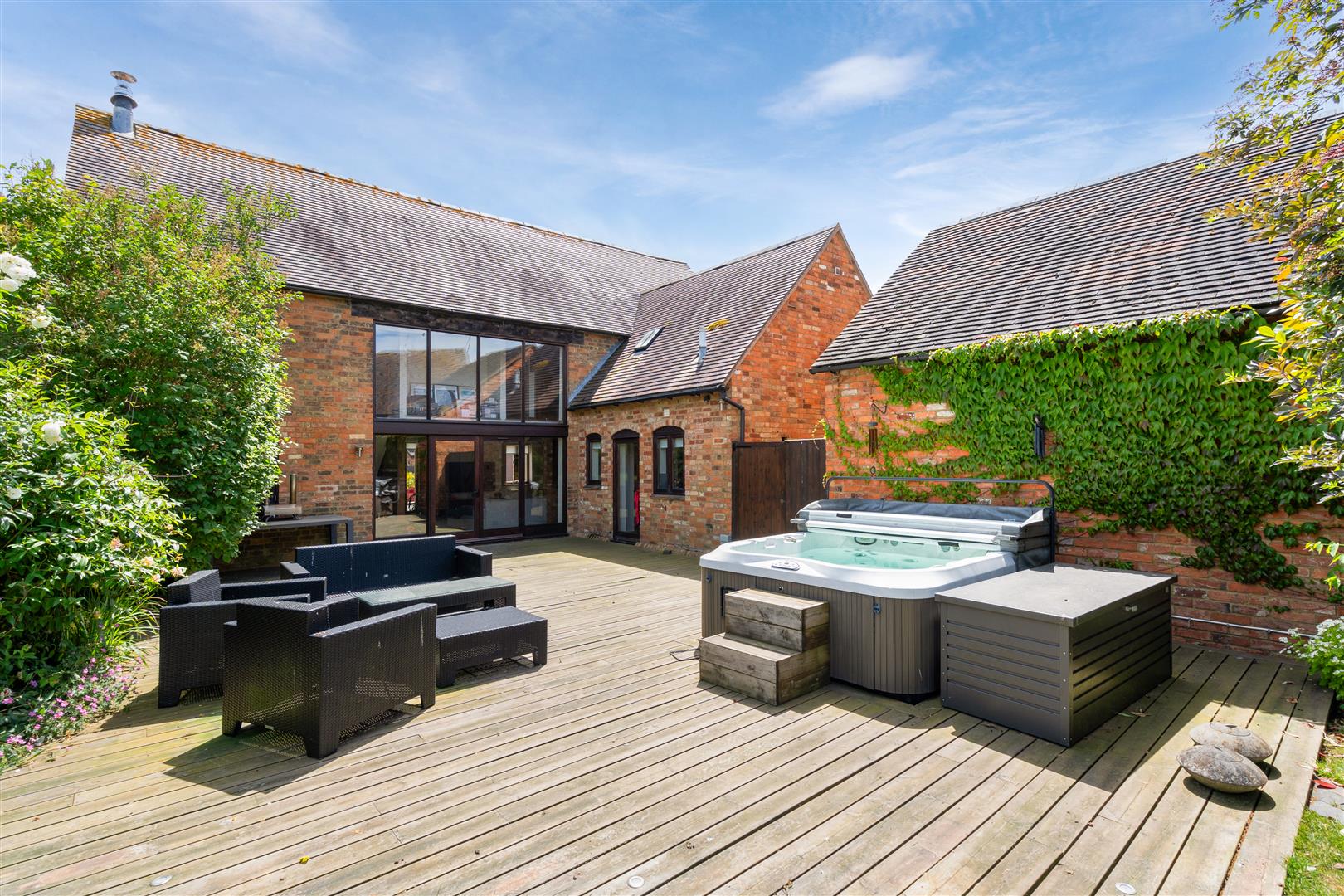 Offering spacious accommodation including a large open plan living and dining room, a separate study/snug, a well-appointed kitchen and a utility room with adjoining WC. Upstairs there is a principal bedroom leading through a vanity/dressing area and a stylish en suite shower room, two further generous double bedrooms and a family bathroom, plus a fitted dressing room/bedroom four. The property is set on the edge of a courtyard, accessed through an archway, with parking to the front on a shared courtyard. Adjacent to the house there is a detached double garage which also has access from the rear. The rear garden is enclosed with hedge and fenced boundaries giving a feeling of privacy. A decked terrace adjoins the house where there is a hot tub and ample space for summer entertaining. The rest of the garden is level, laid to lawn and also features a central patio.