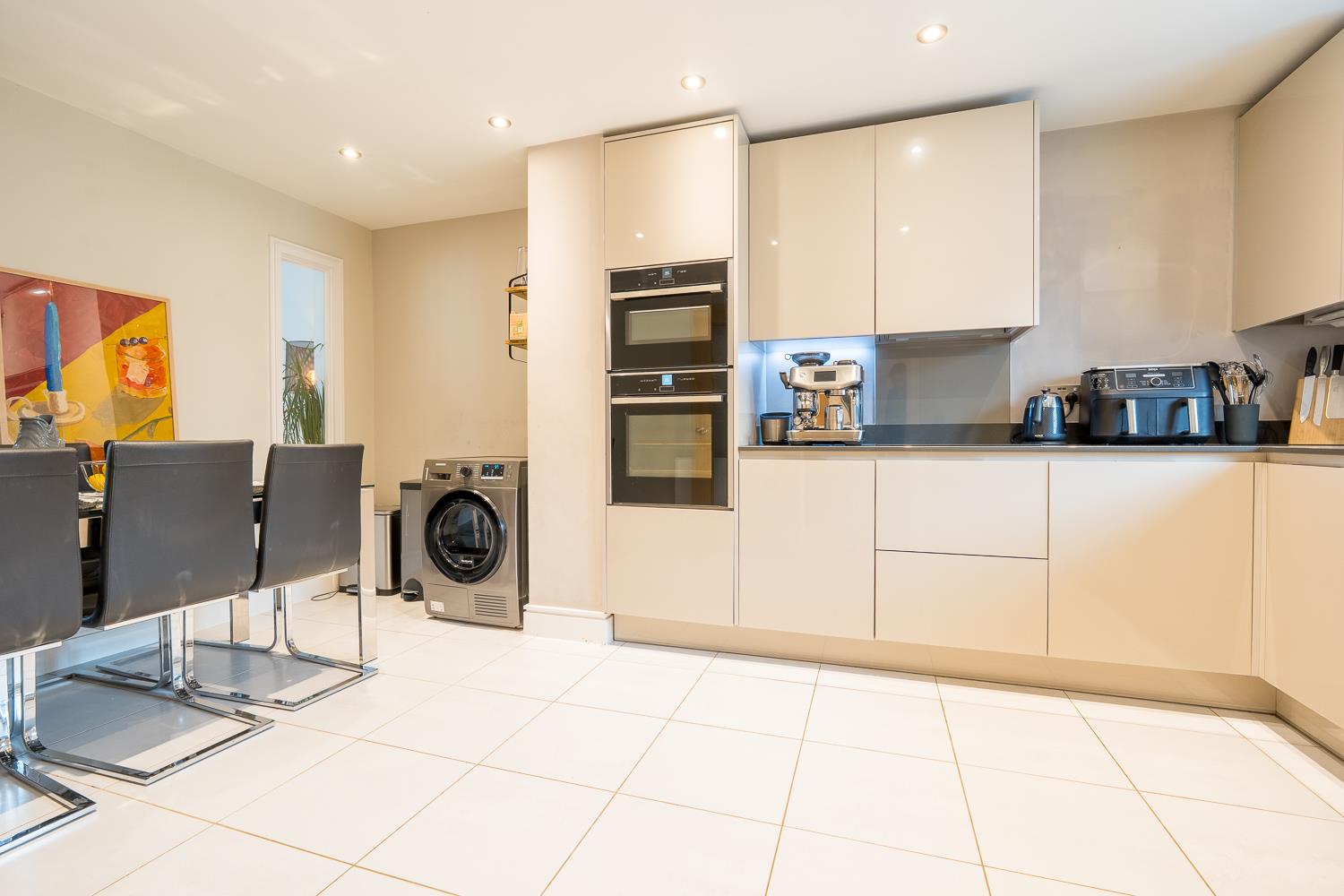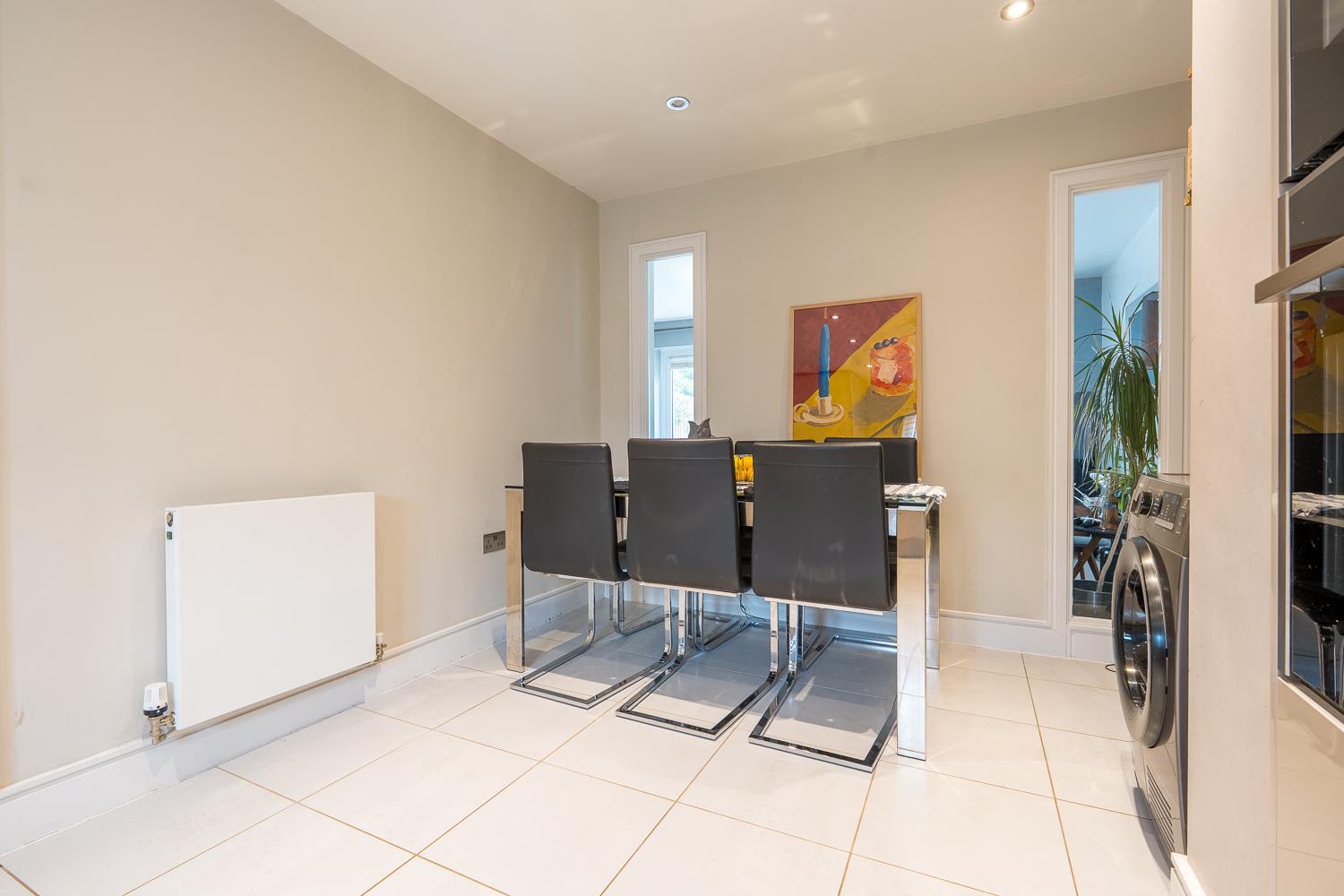 The kitchen and dining area is arranged to the front of the house and fitted with sleek contemporary cabinetry, integrated appliances and ample worktop space. There is room for a dining table, creating a sociable space well suited to everyday living and entertaining.