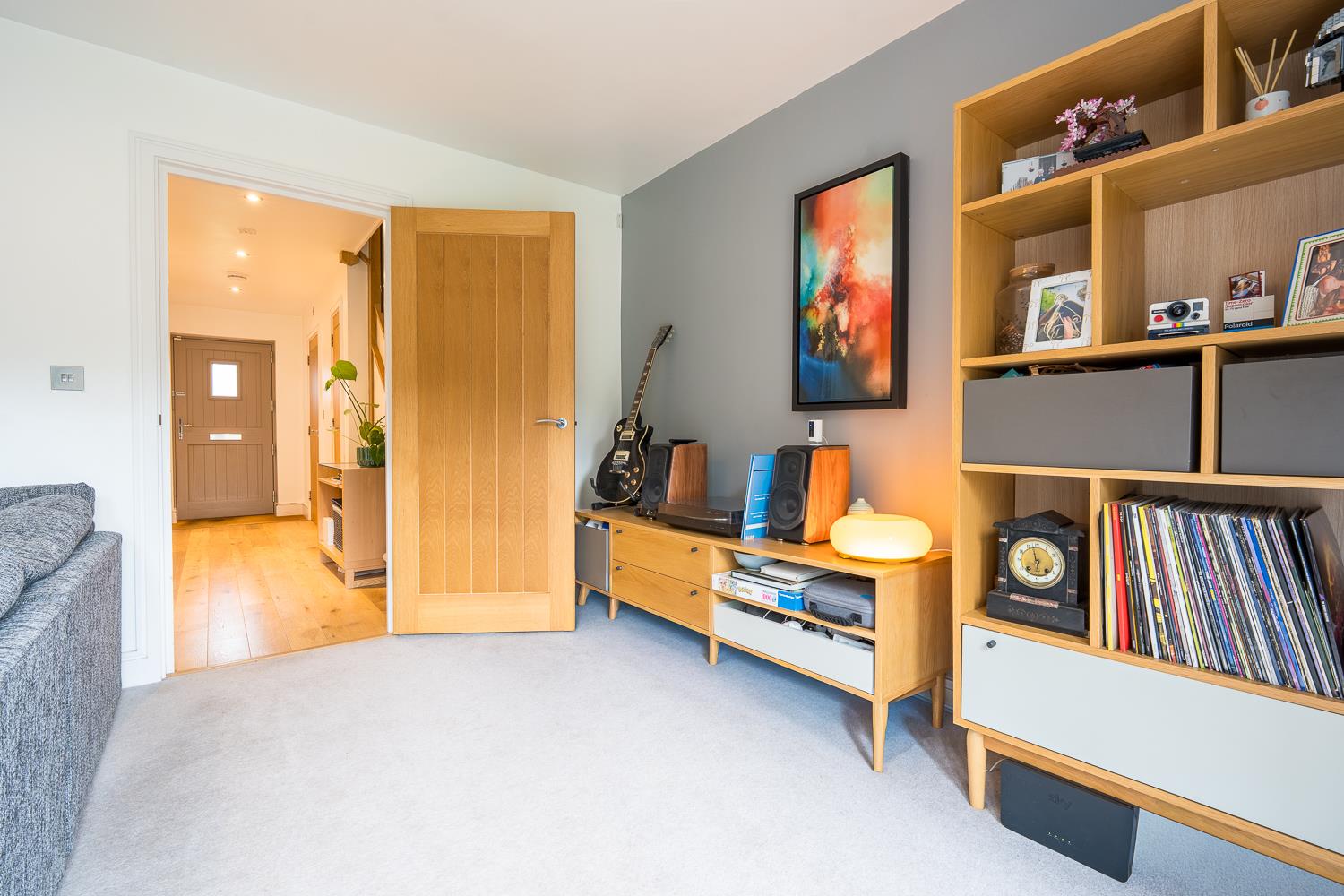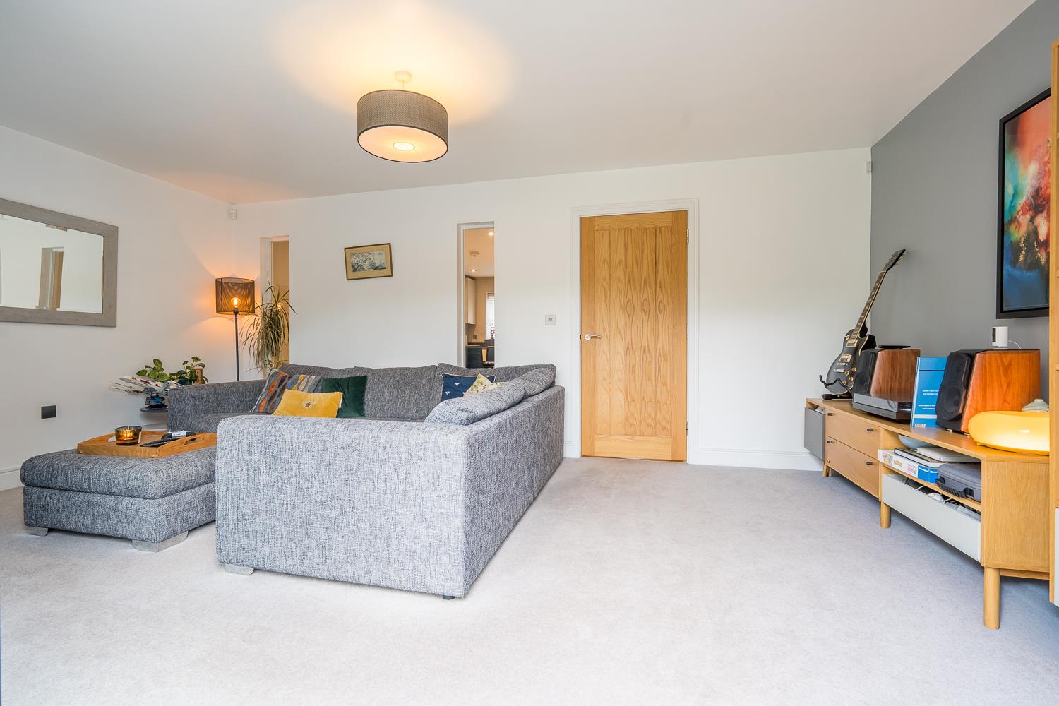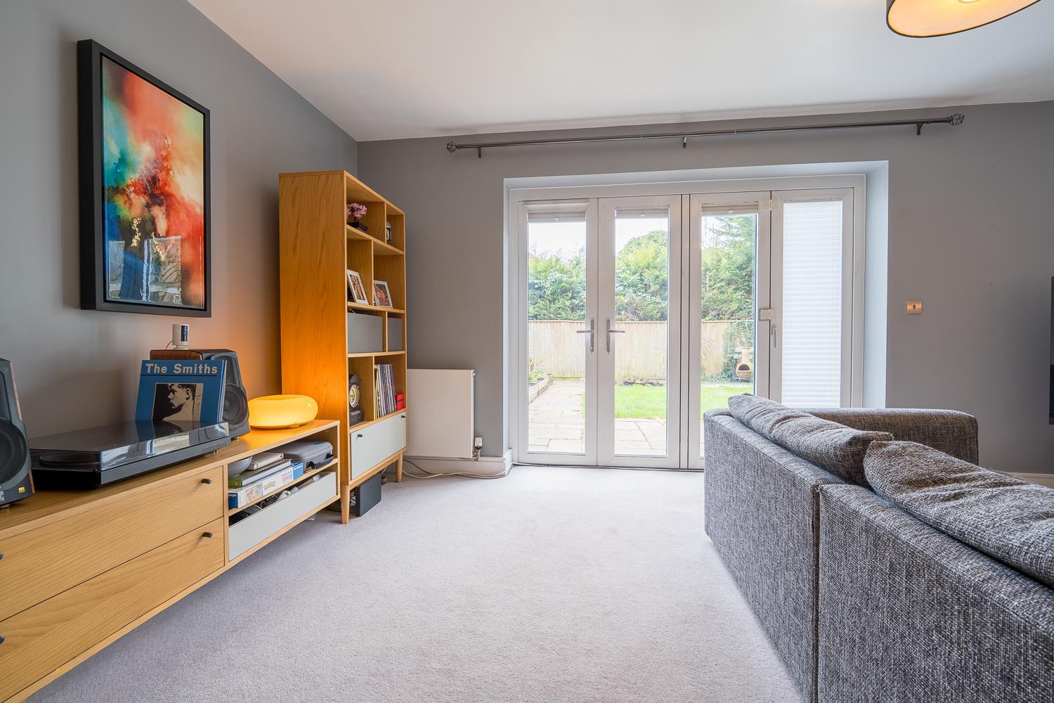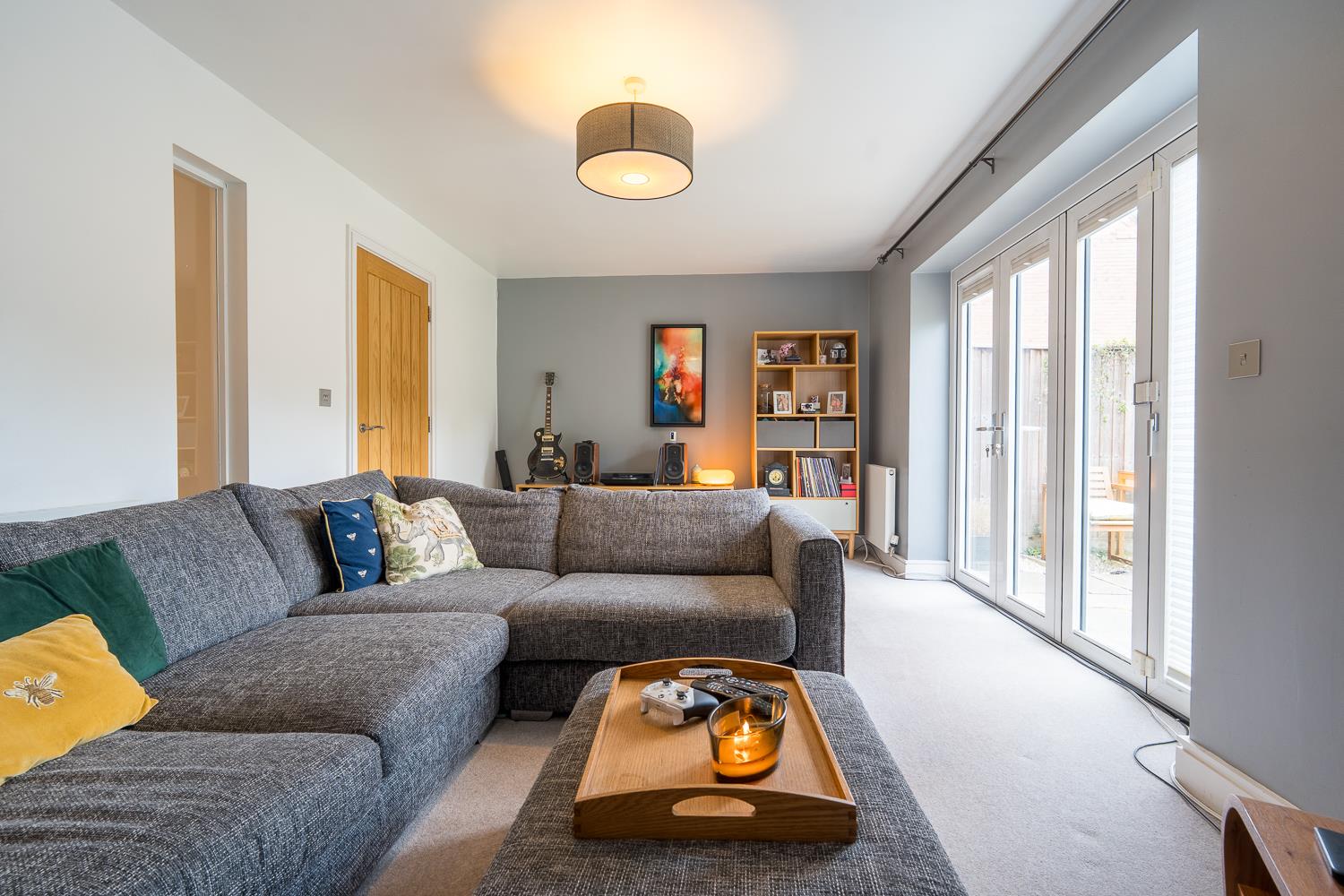 The house is approached through a small front garden and covered entrance, leading into a welcoming hallway with oak detailing to the staircase and doors. A cloakroom sits just off the hall, while to the rear of the property the principal living room is generous in scale, filled with natural light and opening directly onto the garden through wide bi-fold doors. This creates a pleasant connection between inside and out, with the garden becoming a natural extension of the living space during warmer months.