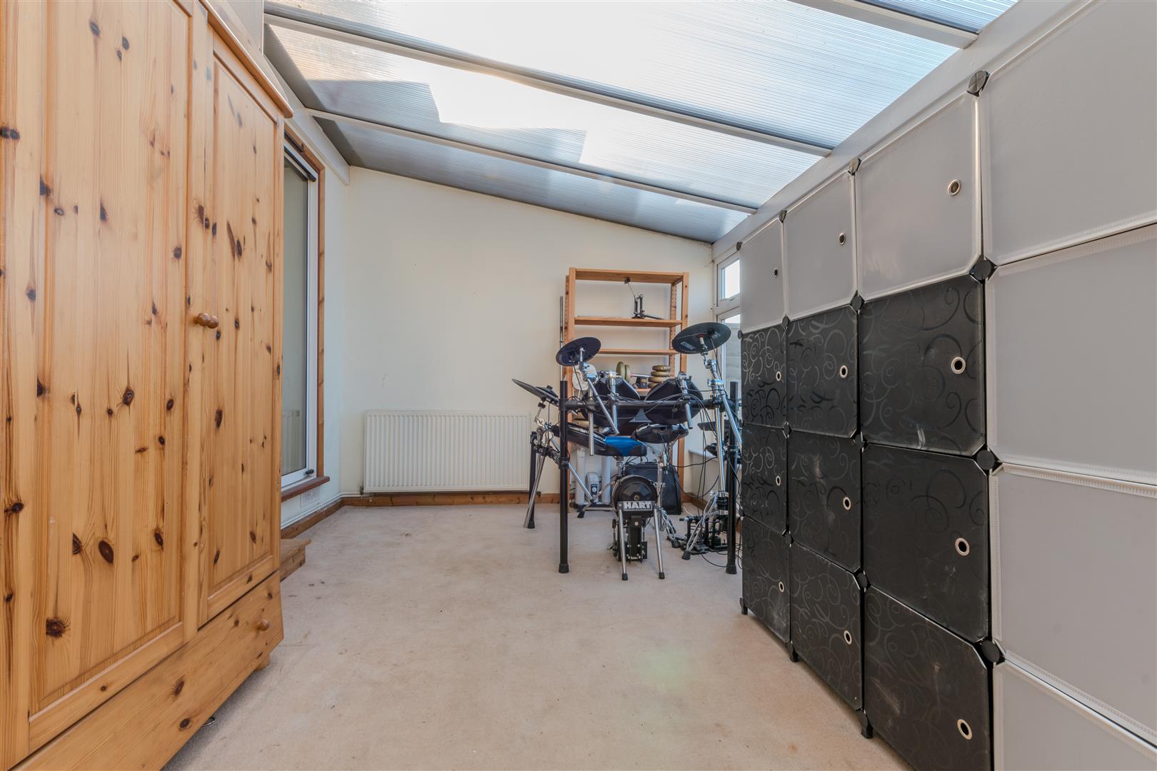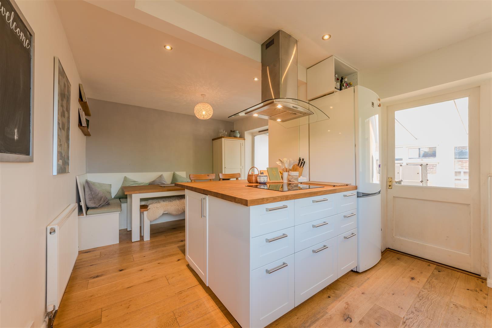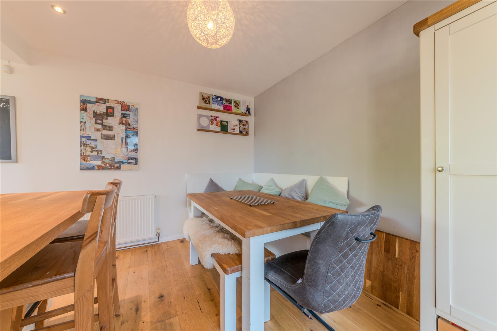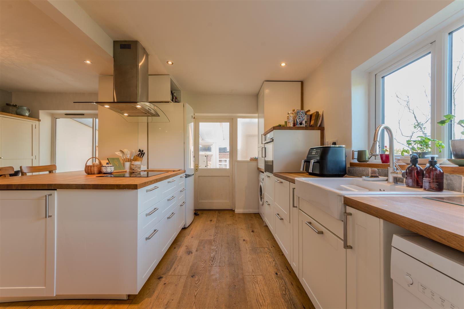 The modern, thoughtfully designed kitchen is immaculately presented and offers ample storage solutions, a convenient waist-height oven, and a charming corner bench with table. Wooden flooring continues here, creating a warm and cohesive feel. Just off the kitchen is a large conservatory, providing additional living space, along with a convenient downstairs WC. The private back patio is accessed here, which links onto the garage and driveway.