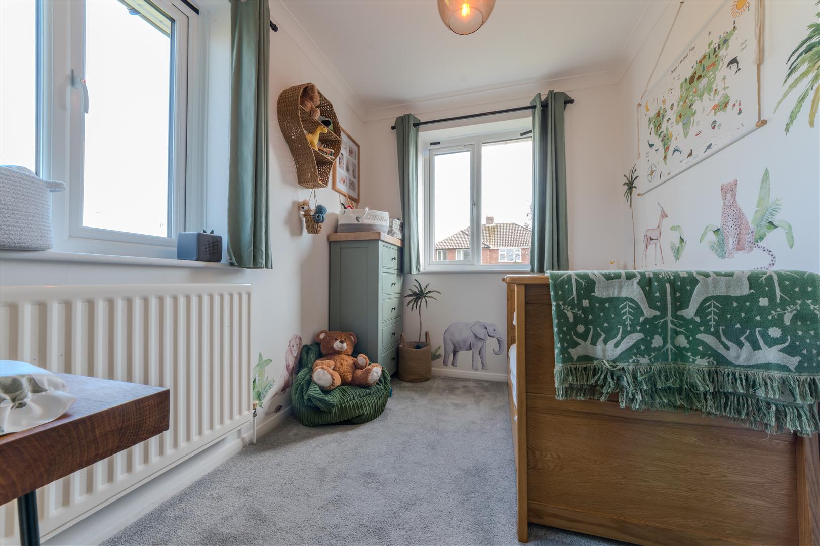 Upstairs, there are three well-proportioned bedrooms, each with large windows allowing for excellent natural light. The master bedroom includes large mirrored built-in wardrobes, offering generous storage. The second bedroom enjoys pleasant views overlooking the open fields opposite the property, while the third bedroom is a good-sized room ideal as a children’s bedroom, nursery, or home office. The upstairs accommodation is completed by a family bathroom.